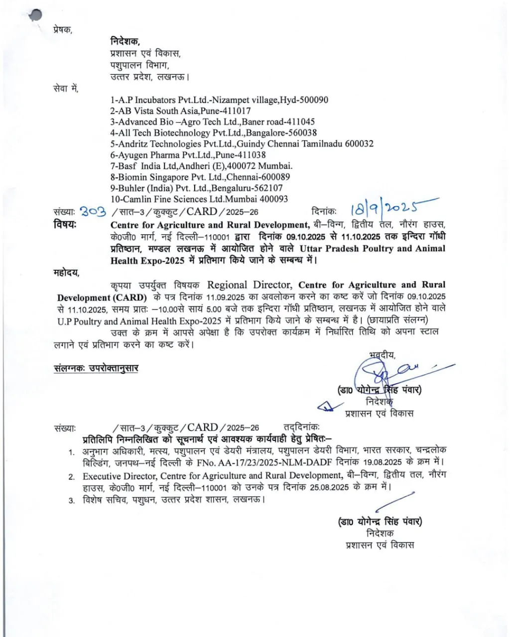 The proposed Uttar Pradesh Poultry & Animal Health Expo 2025 invites entrepreneurs, poultry breeders, pharmaceutical companies (animal vaccines, medicines & nutraceuticals), disease diagnostic laboratories, animal-feed producing companies, animal nutrition specialists, equipment manufacturers, scientists, researchers, academicians, exporters, and other key stakeholders to explore new technologies, opportunities, and developments in the sector.